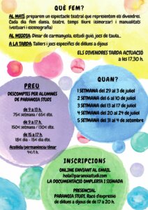 Al matí: Preparem un espectacle teatral que representem els divendres, obert i gratuït. Cada dia ens dediquem a assajar, fent interpretació, dansa, manualitats (vestuari i escenografia). Però també tindrem temps lliure per jugar, descansar i esmorçar.